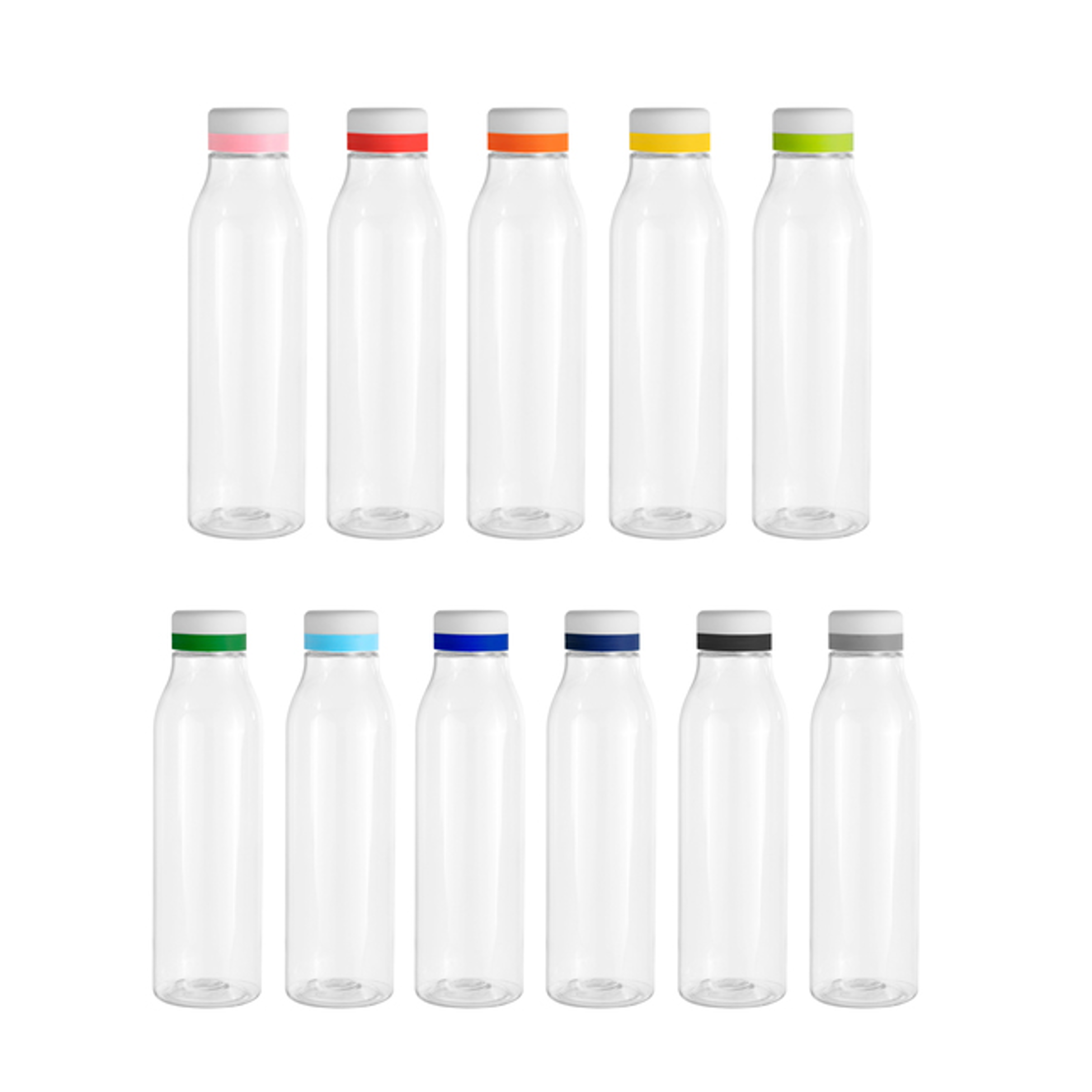 Botella de plástico transparente con tapa a rosca color blanco mate con anillo de silicona de diferentes colores. Personalizado con tu logo. Ideal para kits de bienvenida o regalos corporativos.
