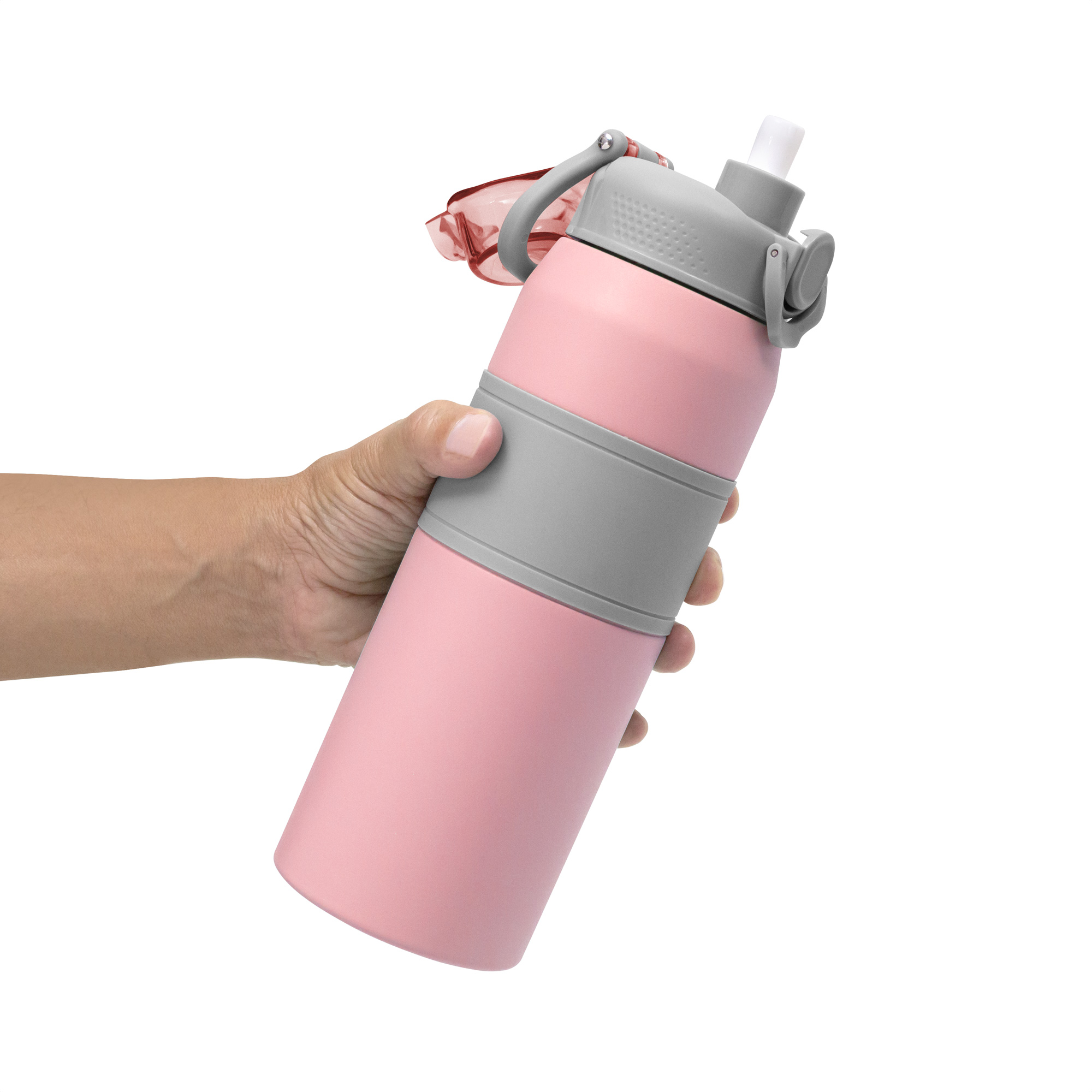 Botella deportiva con doble pared, sellada al vacío. Interior de acero 304 y exterior de acero 201. Pintura powder coat (pintura más duradera y resistente a la corrosión y el paso del tiempo). Tapa plástica a rosca en color gris con anillo de silicona y manija plástica para su agarre, combinada con tapa rebatible en colores translucidos a juego con el color de la botella. Boquilla con sorbete incluido. Grip de silicona color gris para mejor agarre. Mantiene alrededor de 8 hs la temperatura de las bebidas calientes y frías. Medidas: 8 cm x 25 cm. Capacidad: 840 ml. Materiales: Acero inoxidable, silicona y plástico ABS, polipropileno y policarbonato.