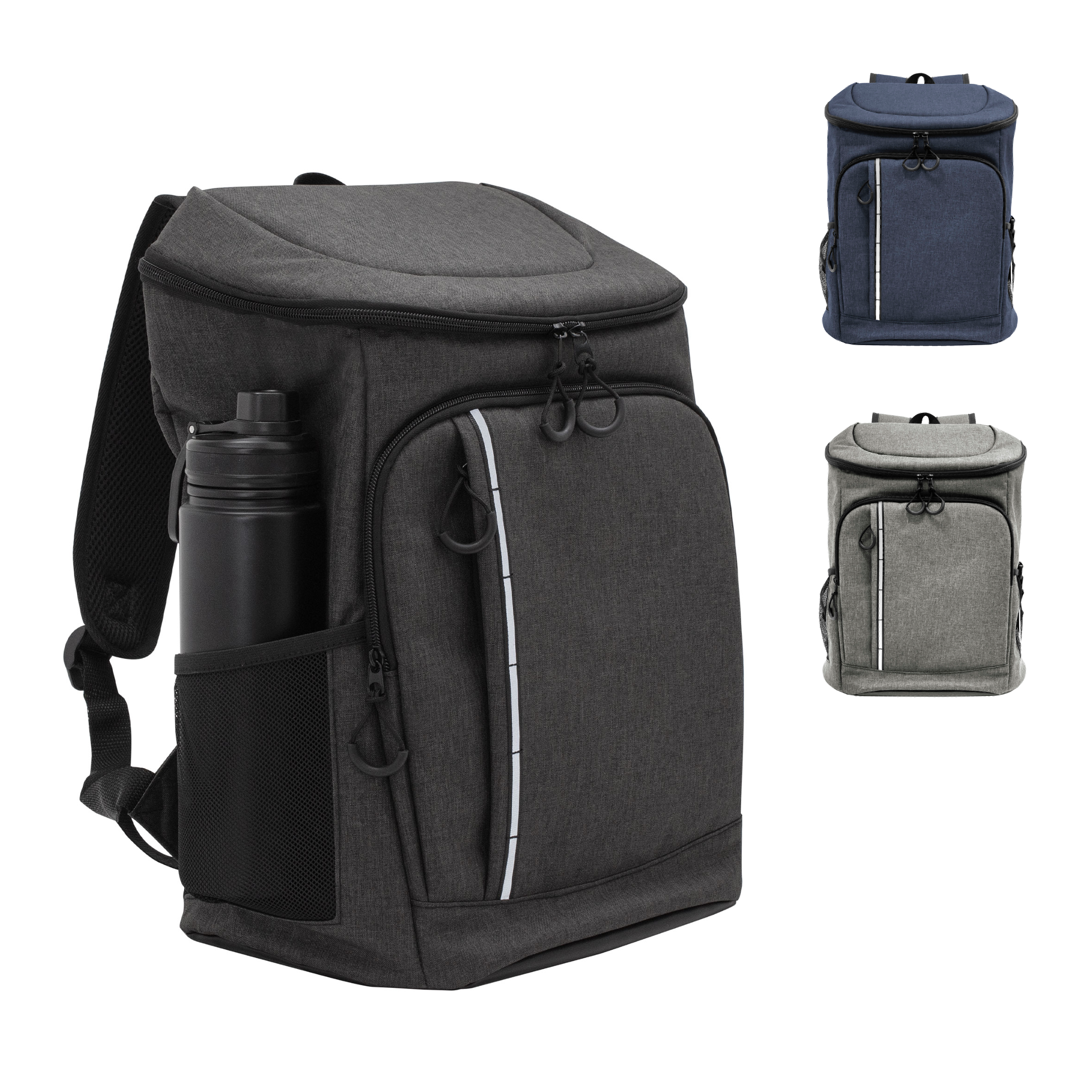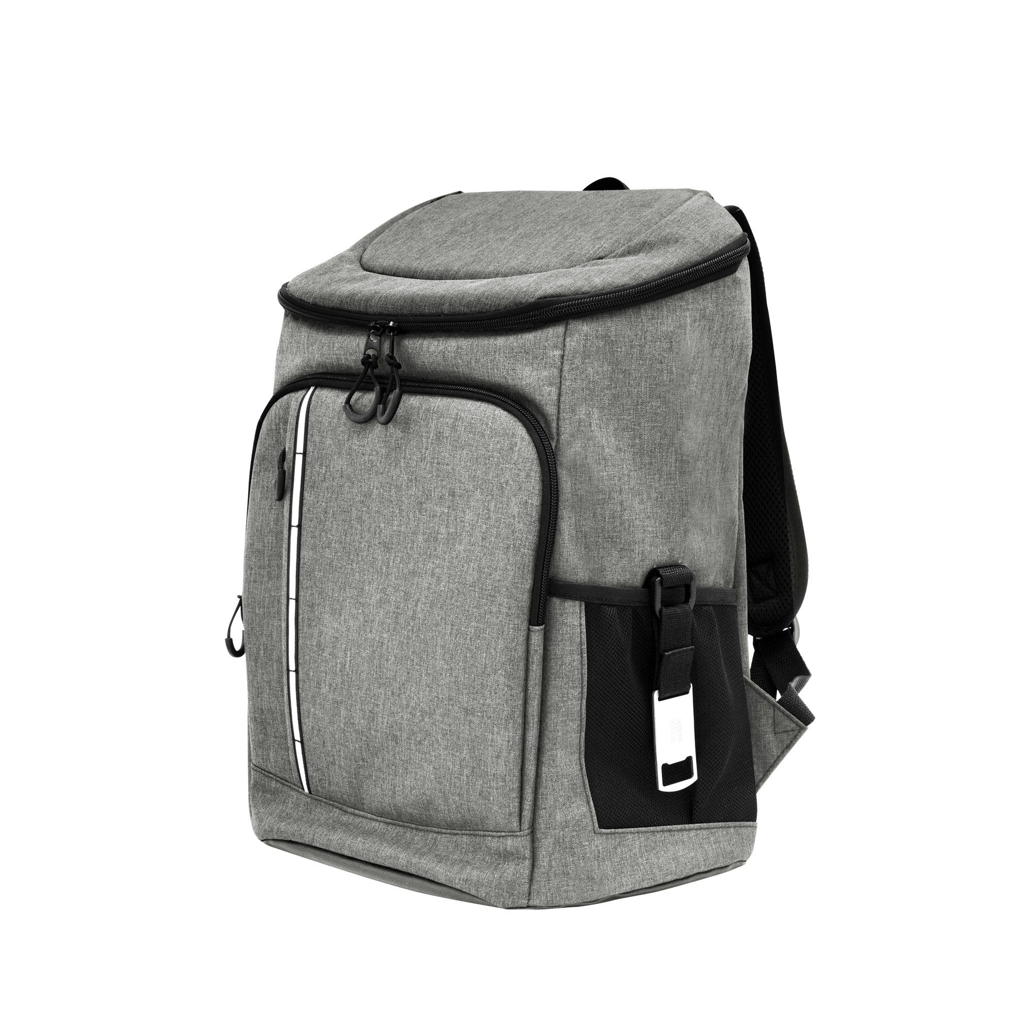 Cooler de capacidad 18 litros aprox. Poliéster Wulong 300D + Interior forrado en PEVA color plata con relleno de espuma de PE. Mochila cooler. Compartimento principal con cierre en la parte superior. Compartimento frontal con cierre, bolsillo interno de red con cierre y bolsillo externo vertical con cierre y banda reflectante. Dos bolsillos laterales de red multipropósito. Incluye abridor de botellas de acero inoxidable (6,3 x 3,3 cm) extraíble. Correas regulables acolchadas. Cierres metálicos. Tiradores de cierre plásticos en forma de U de color negro. Medida: 29 x 43 x 18 cm.