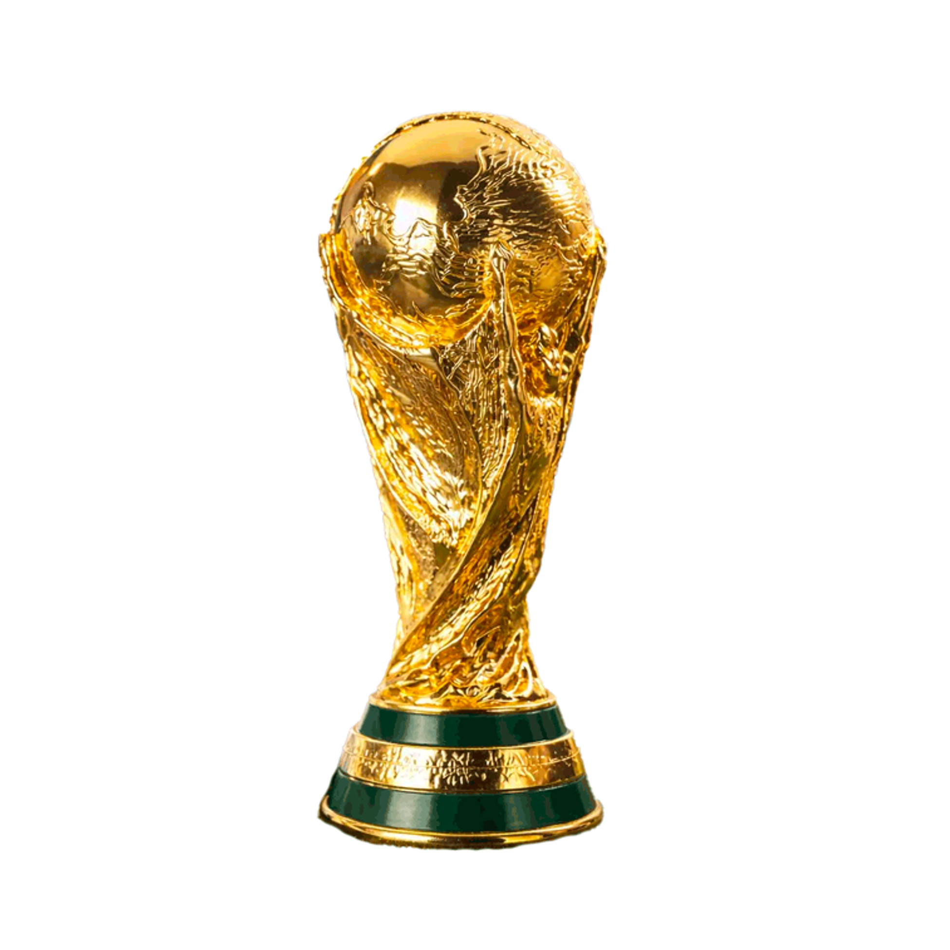 Copa del Mundo color oro disponible en 13 y 21 cm. Réplica decorativa de plástico con terminación brillante, ideal para premios, eventos deportivos y reconocimientos.