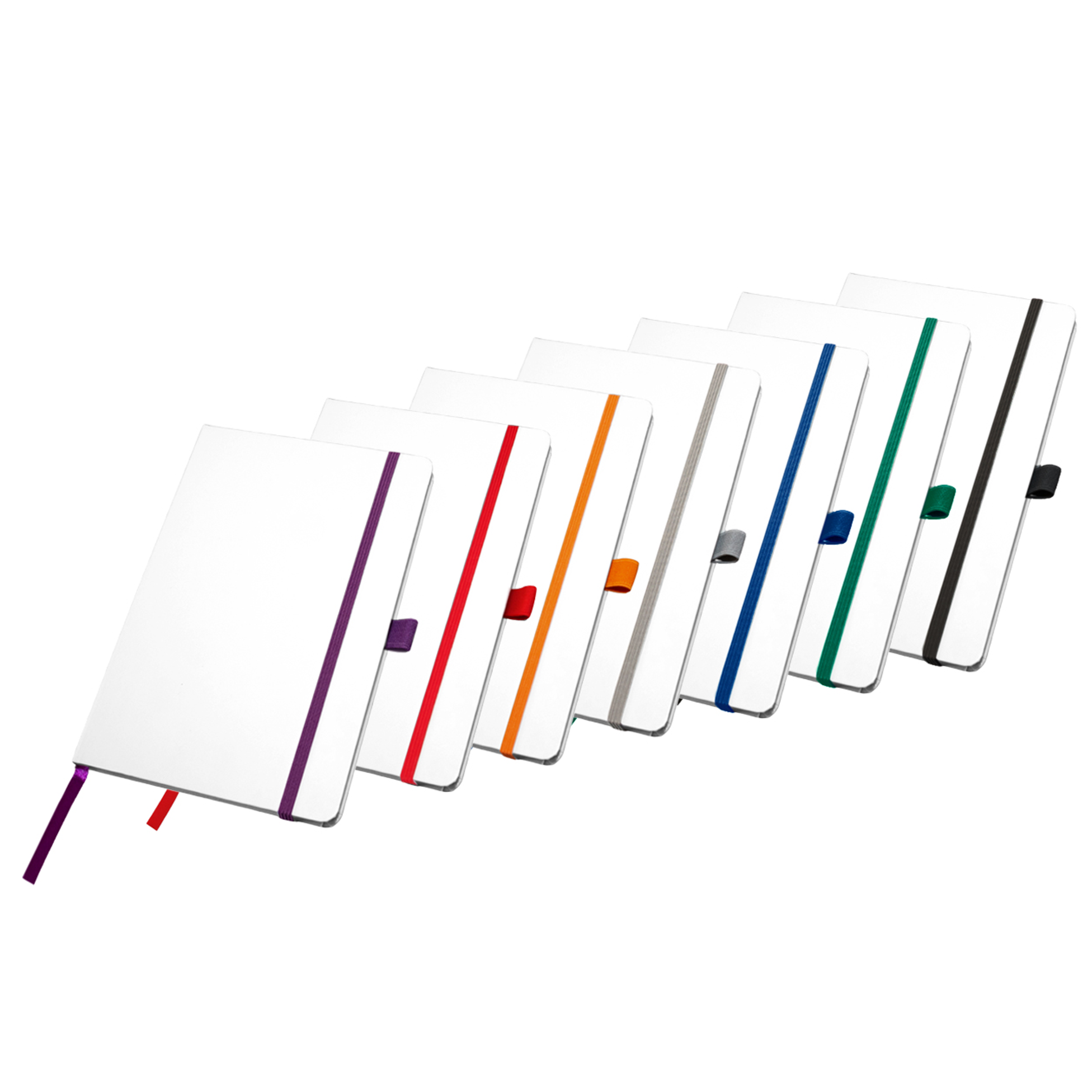 Cuaderno A5 con tapa blanca – práctico y elegante para regalos corporativos Cuaderno A5 con tapa dura blanca, fabricada en PVC y cartón rígido de 1,5 mm. Contiene 80 páginas rayadas + 2 en blanco, cinta marcapáginas, porta lapicera y elástico de cierre a color. Papel blanco de 70 g/m² con certificación FSC. Se entrega en bolsa individual de polipropileno. Ideal para kits de bienvenida, capacitaciones y eventos corporativos con logo.