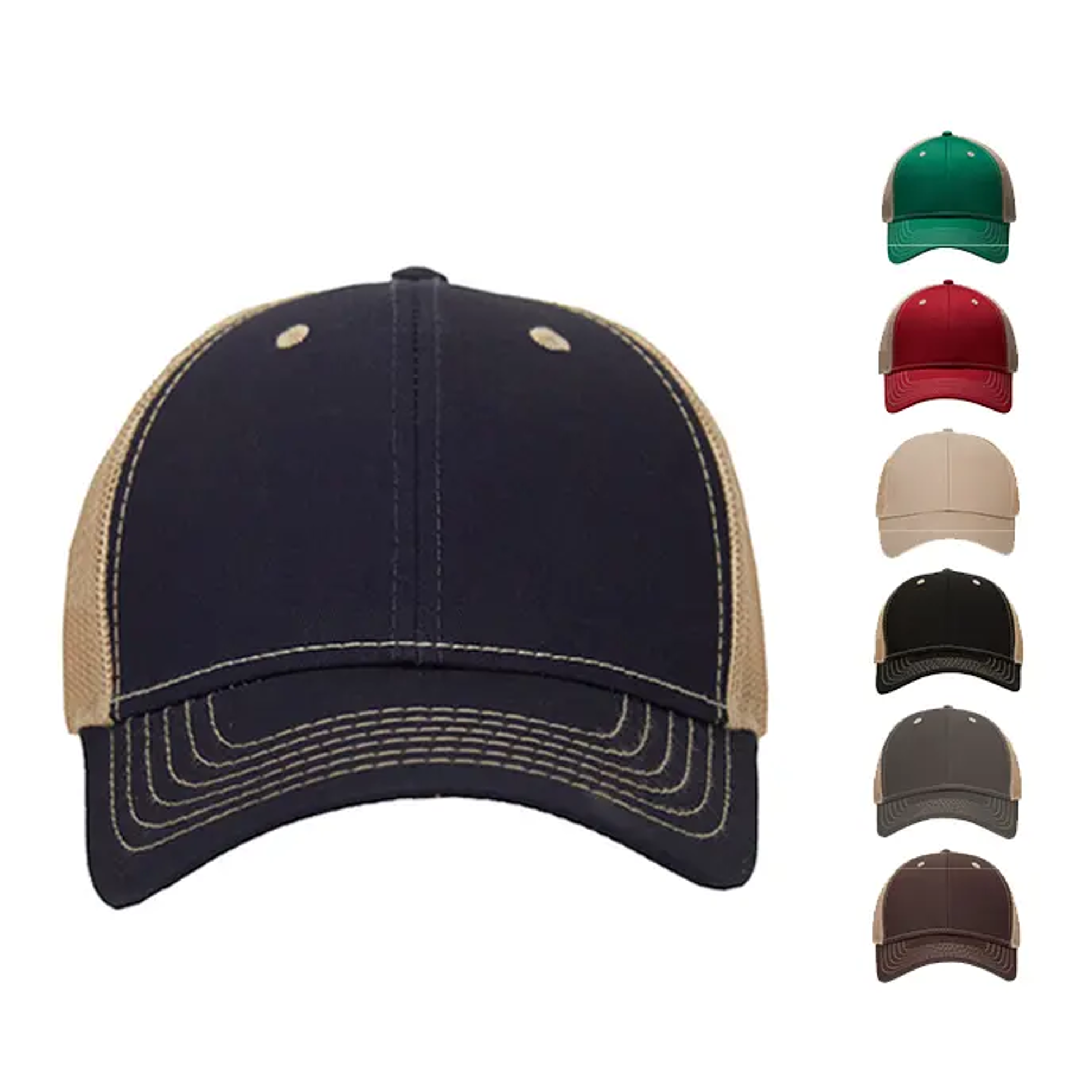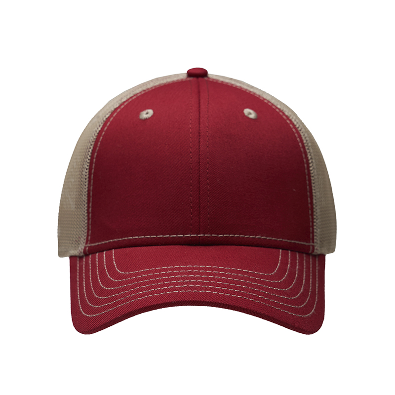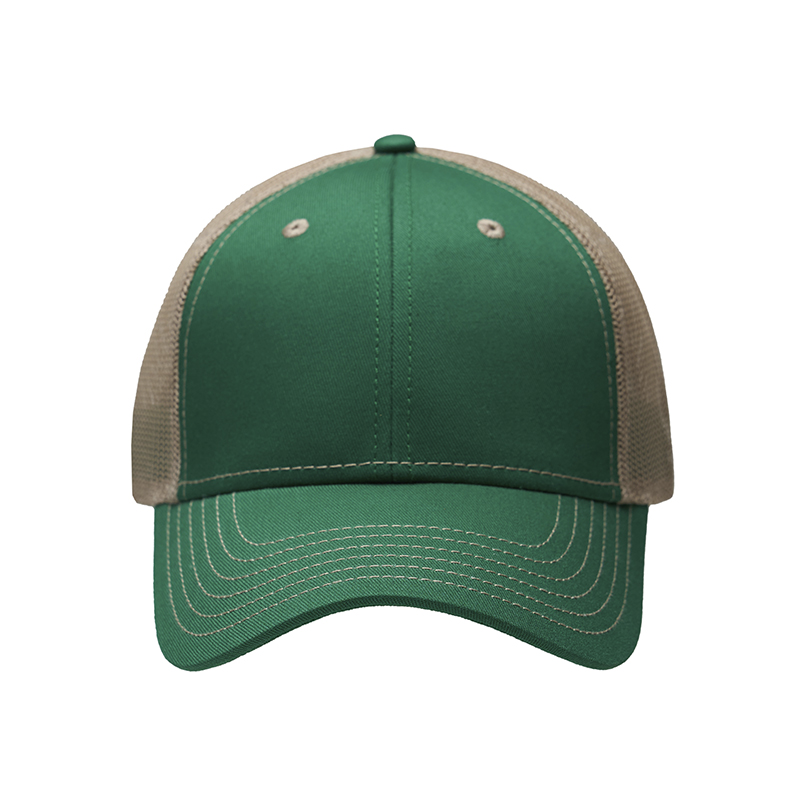 Gorro de 6 gajos con visera. El dorso del del gorro cuenta con diseño de tela de red de color kaki y ajuste con broche. Posee un sticker metalizado en la visera. Logo bordado.
