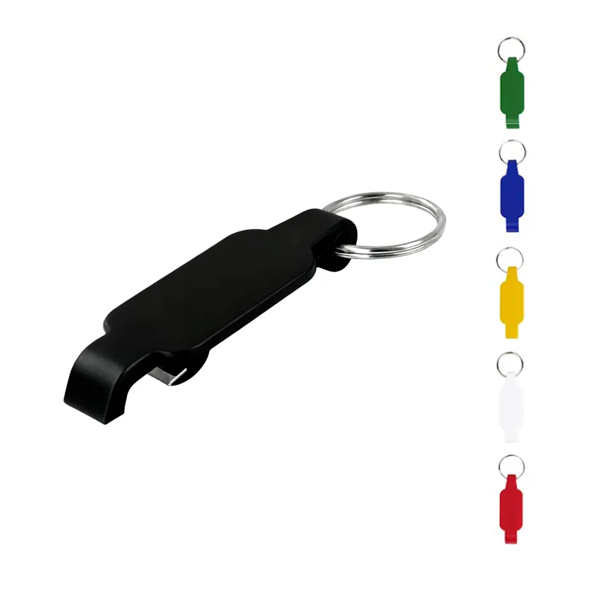Llavero destapador fabricado en resistente plástico ABS. Cuenta con argolla metálica y diseño compacto disponible en varios colores vibrantes. Es ideal para eventos promocionales, uso diario o como accesorio funcional en llaveros personales.