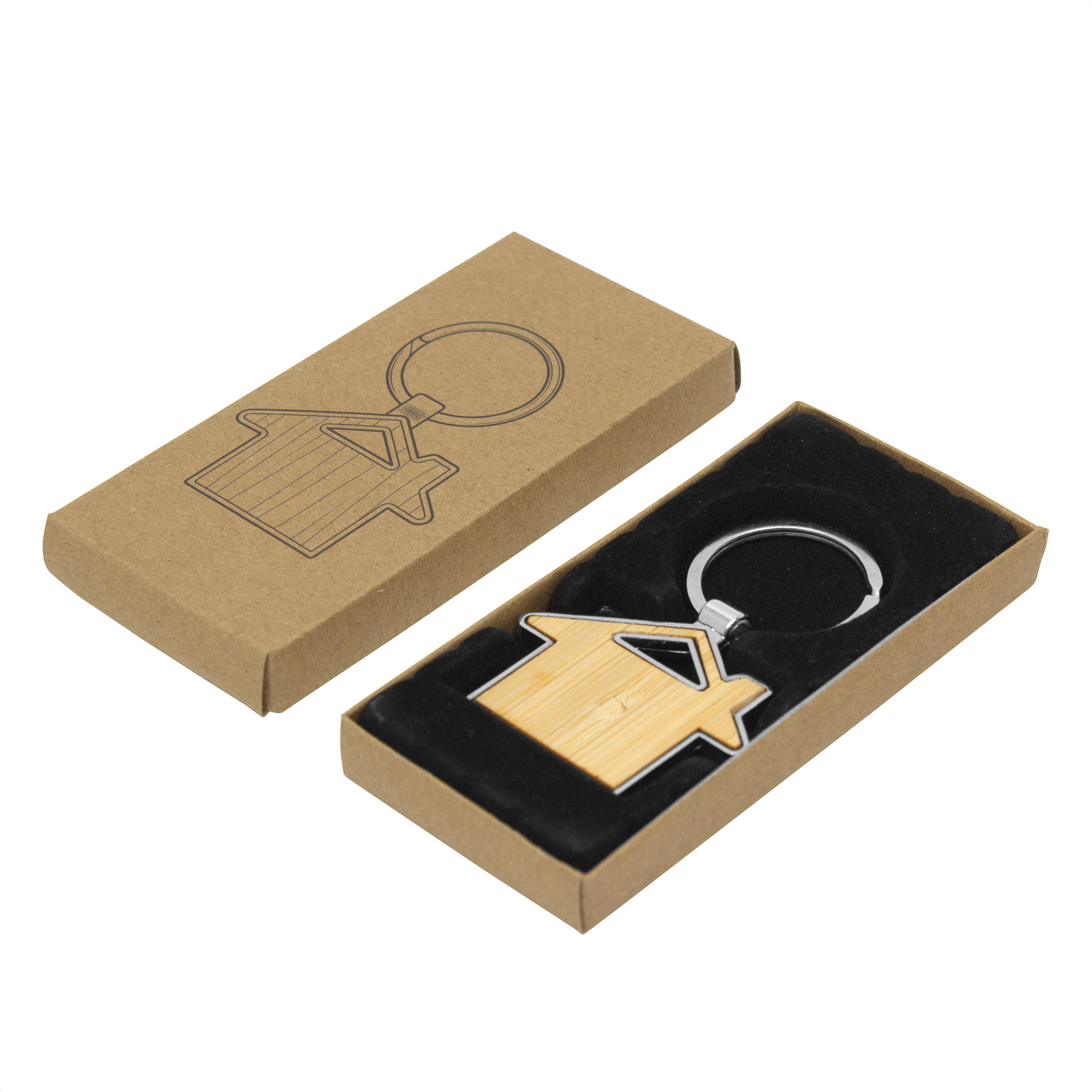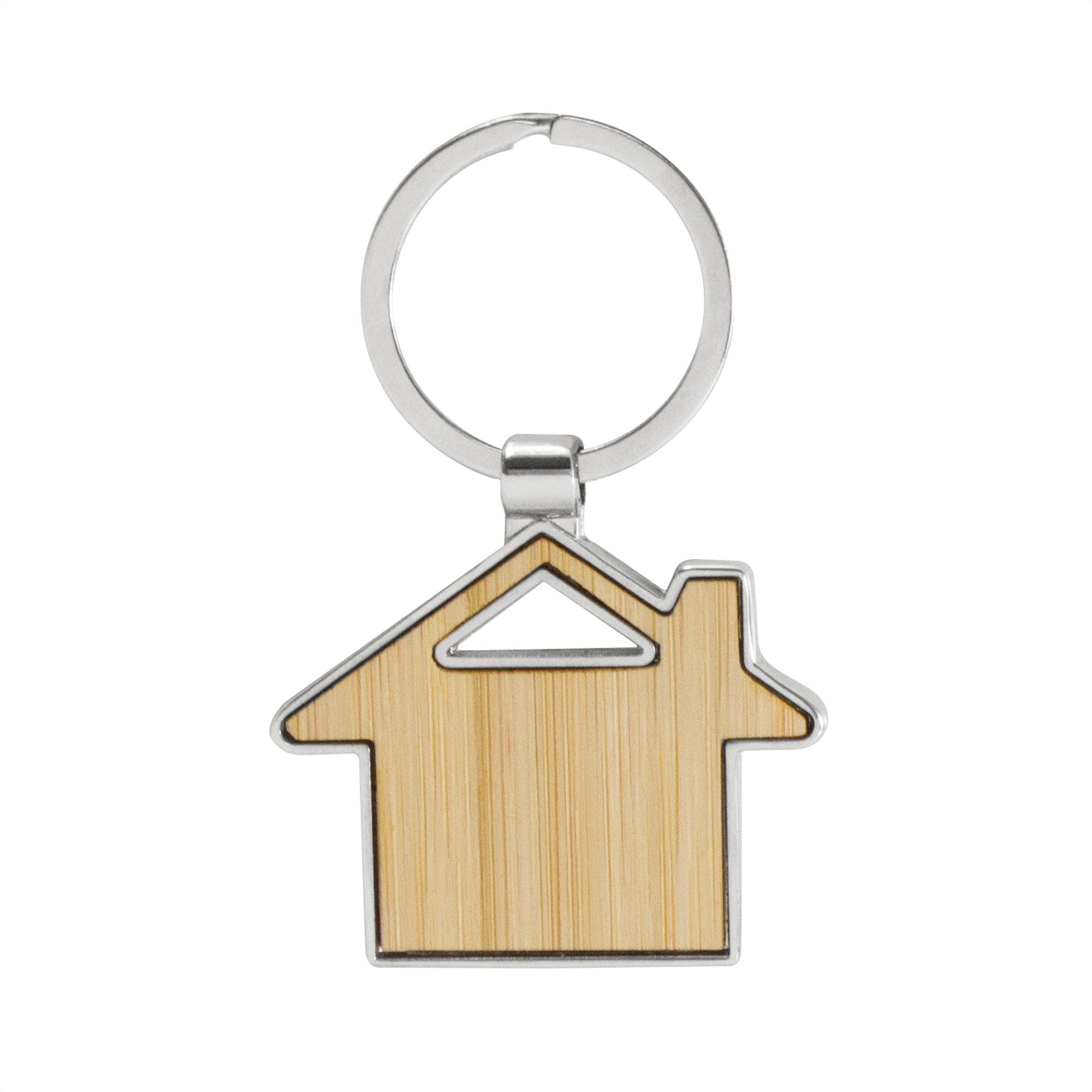 Llavero con forma de casa. Estructura metálica con aleación de zinc con acabado brillante y panel frontal de bambú barnizado.