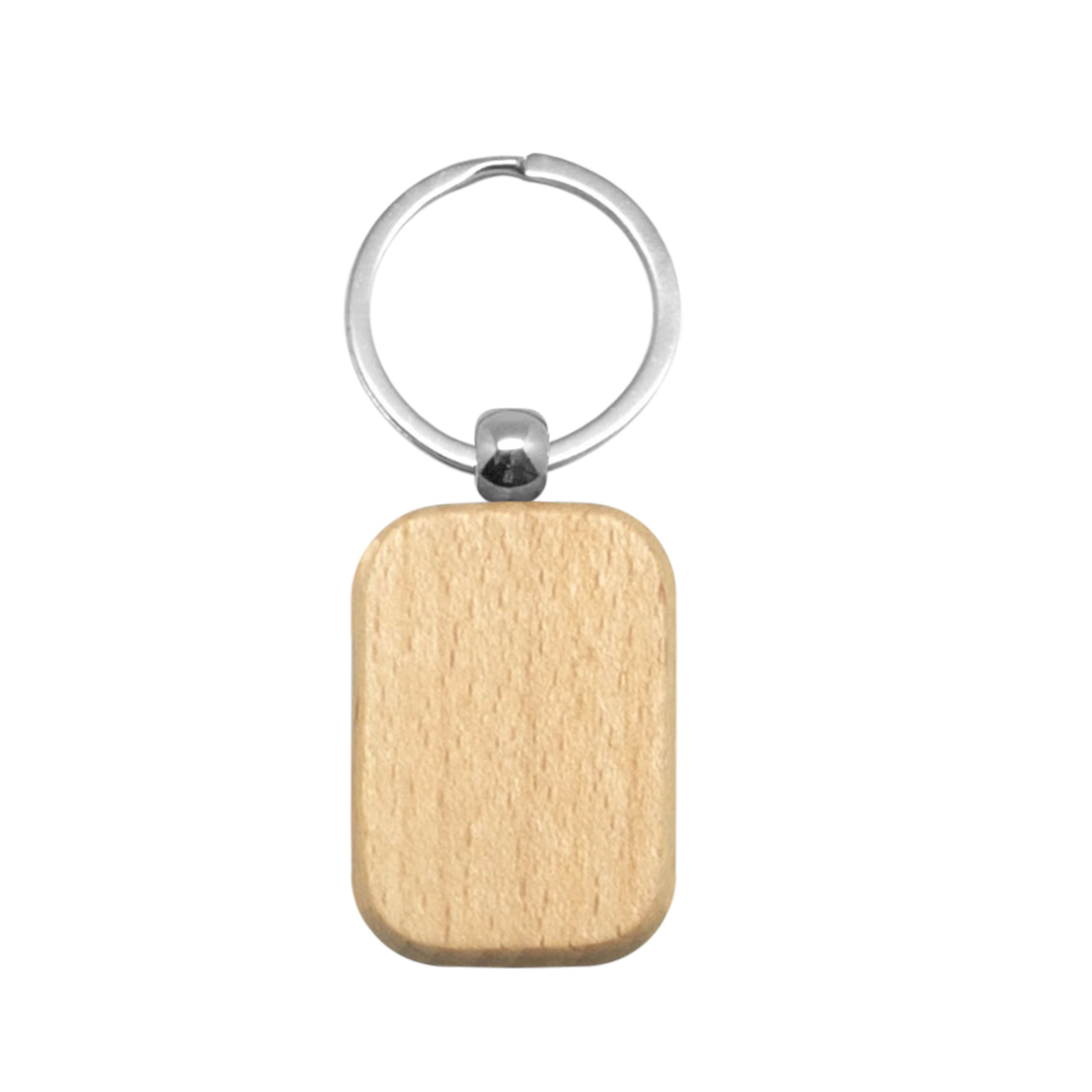 Madera. 4,2 x 3 x 0,7 cm. Llavero rectangular con aro metálico (la medida no incluye el aro).