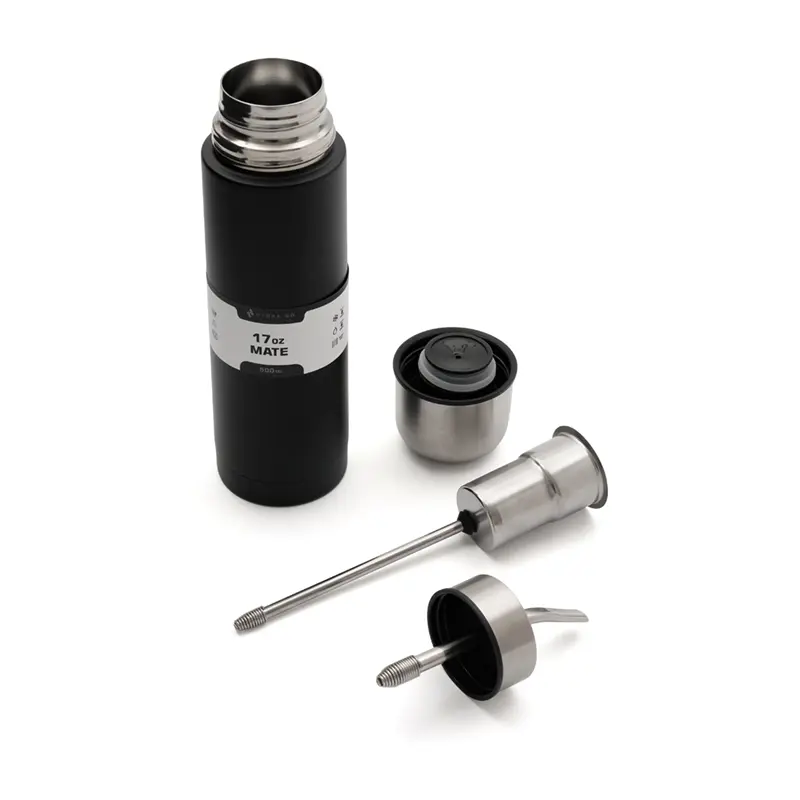 Mate listo de acero inoxidable de doble pared, fabricado en acero 304 con acabado powder coating color negro. Cuenta con bombilla incorporada de acero desmontable, tapa con rosca de acero inoxidable y cuerpo térmico que mantiene la temperatura. Es ideal para tomar mate de forma práctica, tanto en el trabajo como al aire libre, sin necesidad de llevar accesorios adicionales, y gracias a su diseño versátil, también puede utilizarse únicamente como termo o como recipiente para mate según la ocasión.