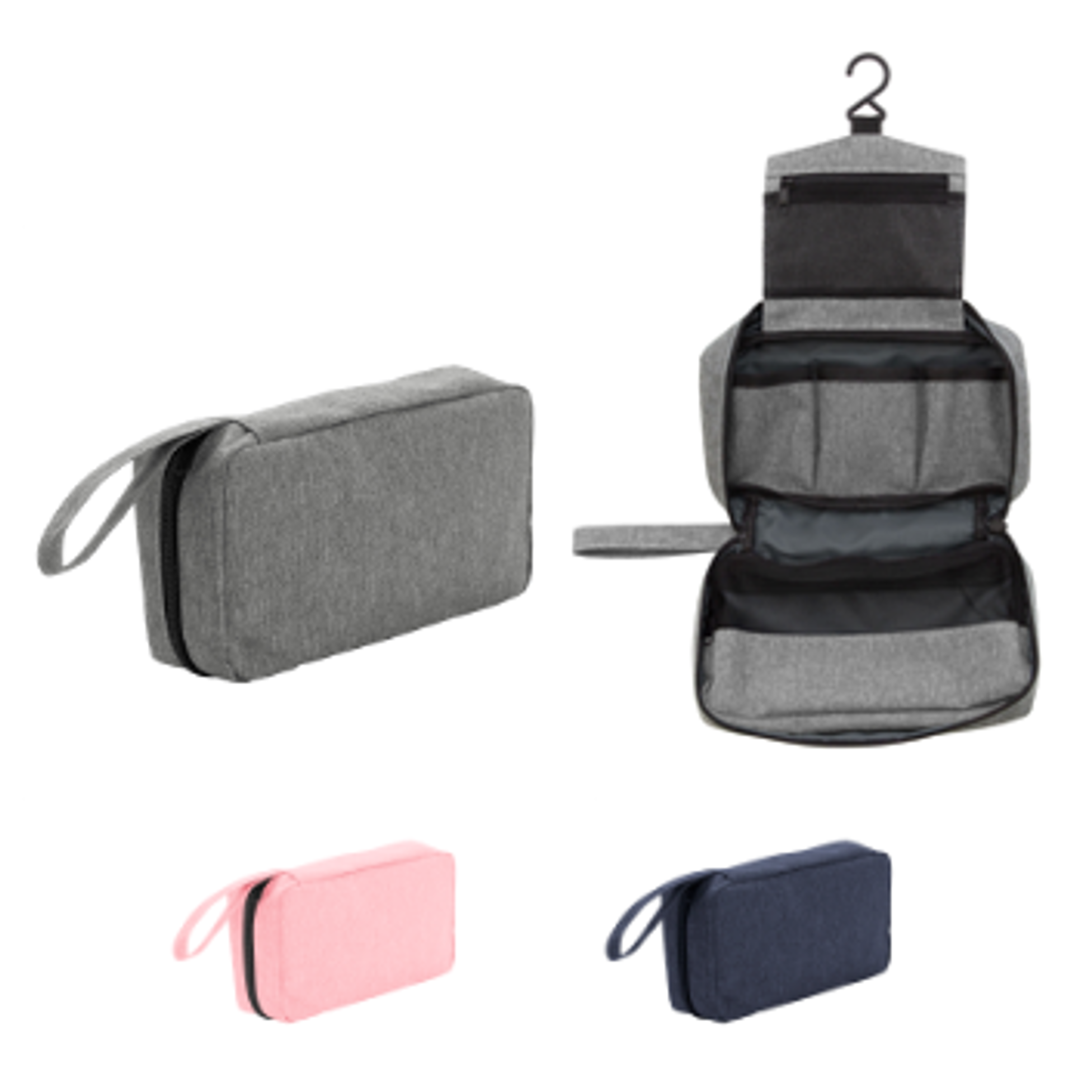 Necessaire colgante. Compartimento principal con cierre y asa de tela para transportar. Interior: compartimento superior rebatible con gancho para colgar y bolsillo de red con cierre, compartimento central con 3 bolsillos y amplio compartimento inferior con ventana de red y cierre.