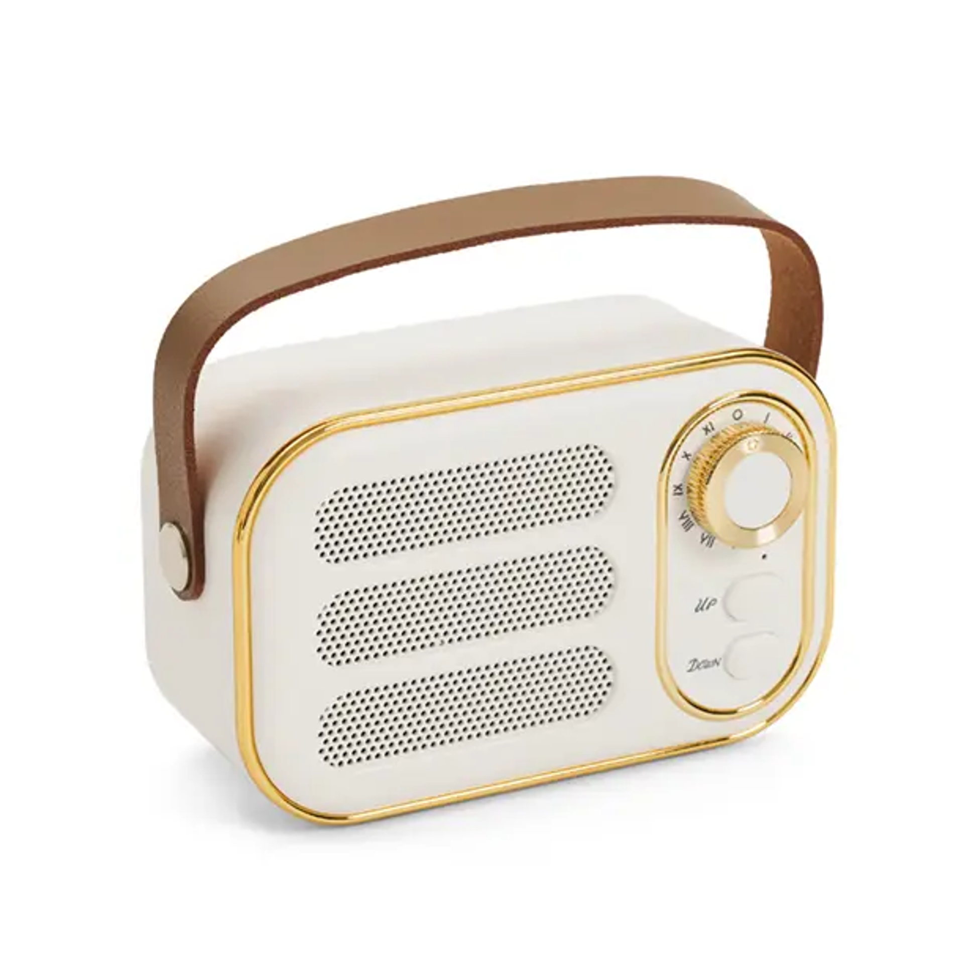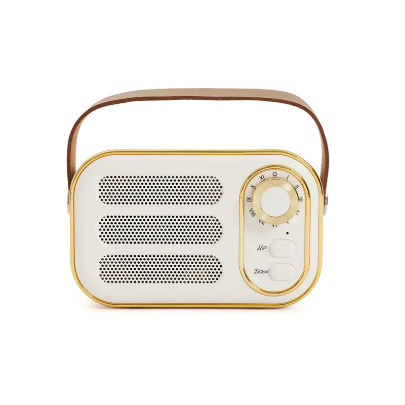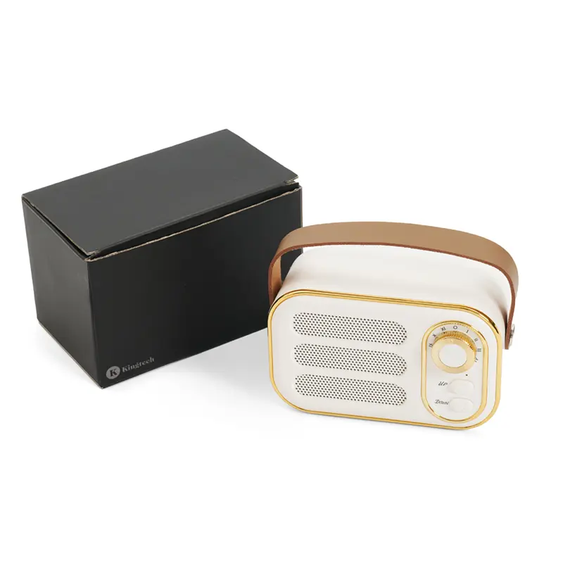 Parlante vintage blanco con correa. Hecho de plástico ABS y cuero PU. Cuenta con correa superior, perilla frontal, botones de control, conexión USB-C, radio FM (87.5–108 MHz), y compatibilidad con Bluetooth, tarjeta TF, USB y entrada AUX. Es ideal para ambientar espacios con estilo retro mientras disfrutás de tu música favorita. Marca Kingtech.