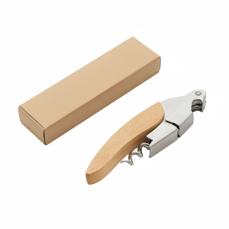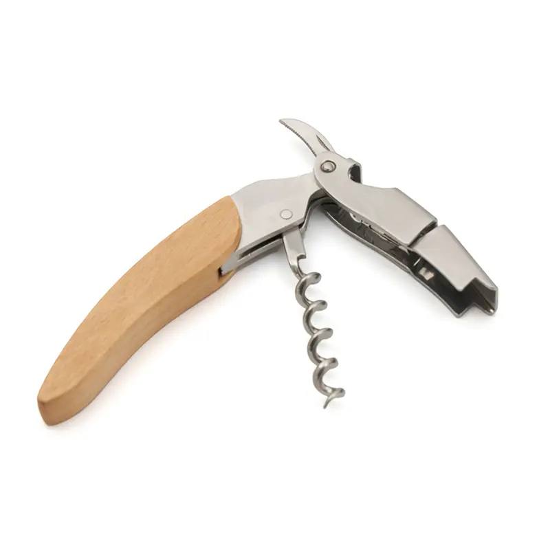 estapador multiple con mango de madera. Fabricado en madera natural y acero inoxidable 420. Cuenta con sacacorchos de doble palanca, cuchilla retráctil y mango ergonómico de madera. Es ideal para abrir botellas de vino con facilidad, para uso en el hogar o en servicio profesional.
