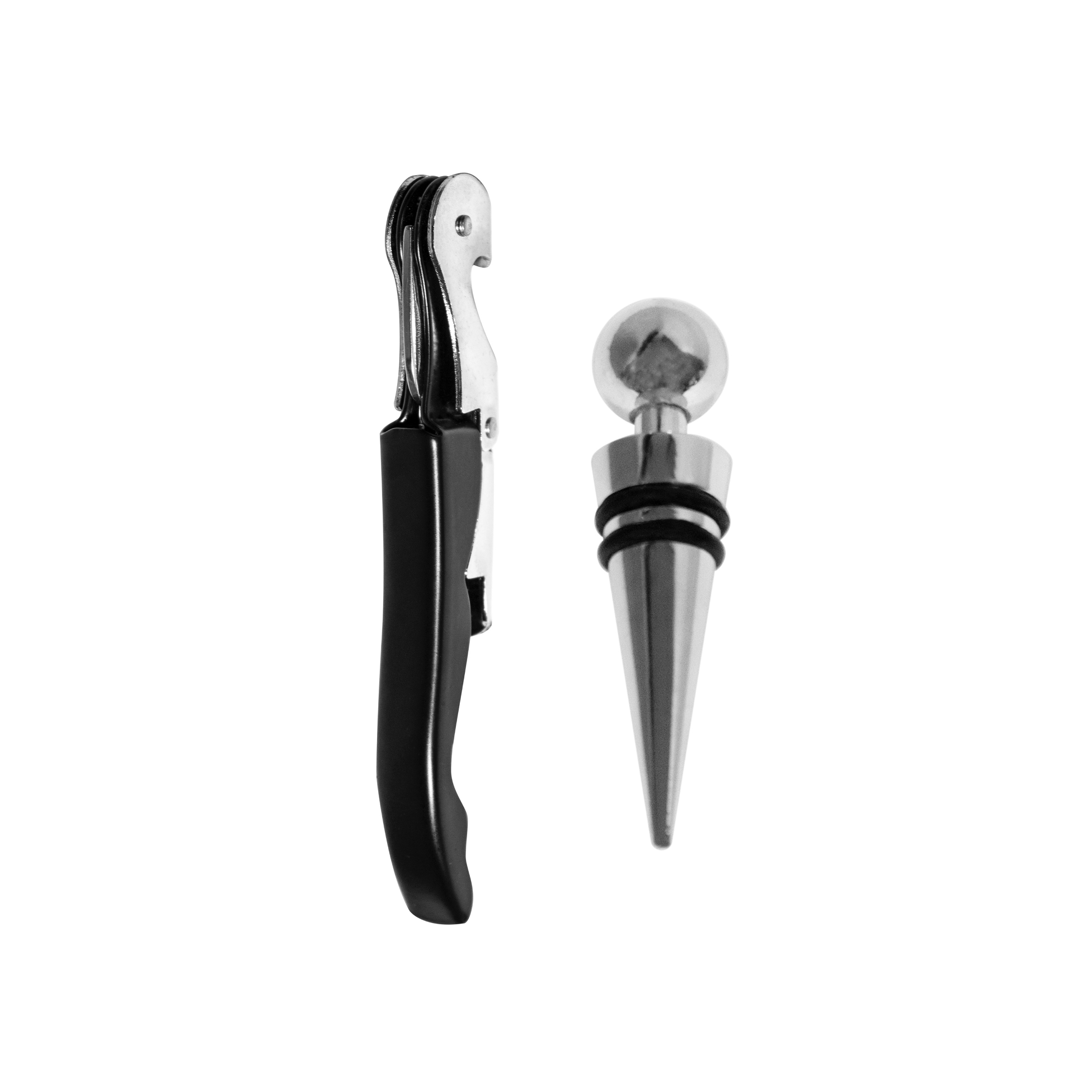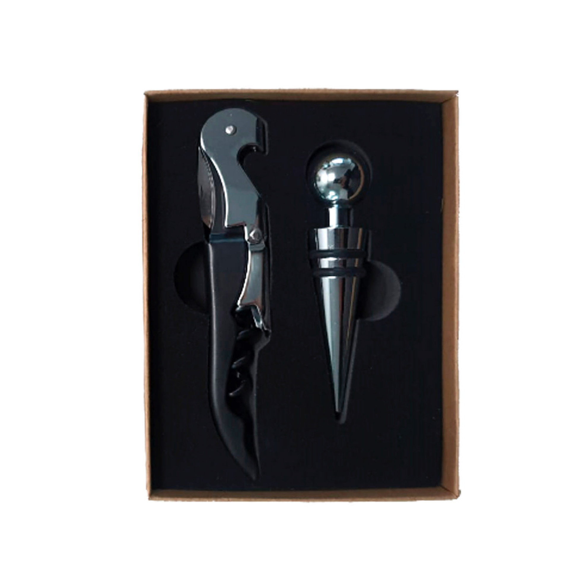 Set de accesorios para vinos. Sacacorcho y tapón en metal. Estuche de cartón. Presentación en caja de regalo.