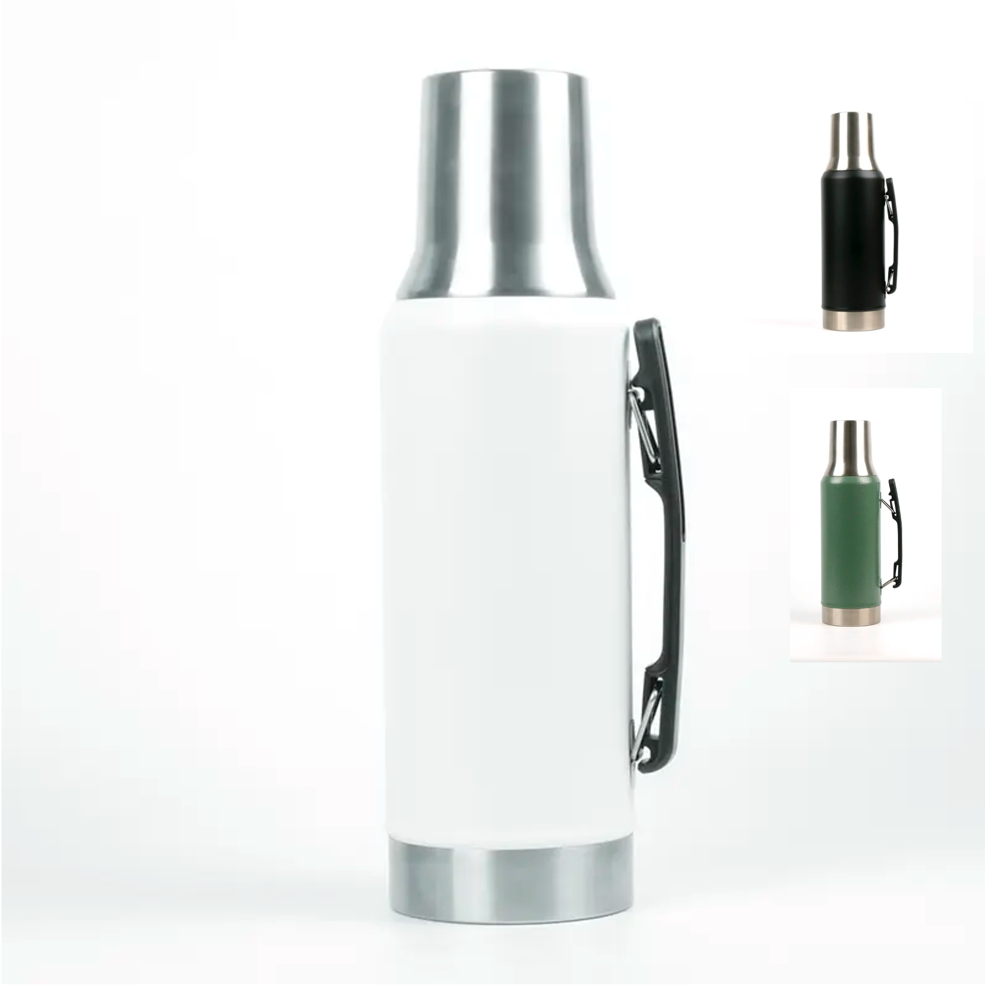 Termo de acero inoxidable con tapa multifunción, fabricado en acero interior 304 y exterior 201. Cuenta con tapa que puede utilizarse como mate, pico cebador, sistema de cierre seguro y asa lateral para un agarre cómodo. Es ideal para mantener bebidas calientes o frías durante largas jornadas de trabajo, actividades al aire libre o viajes, gracias a su capacidad térmica y diseño resistente.